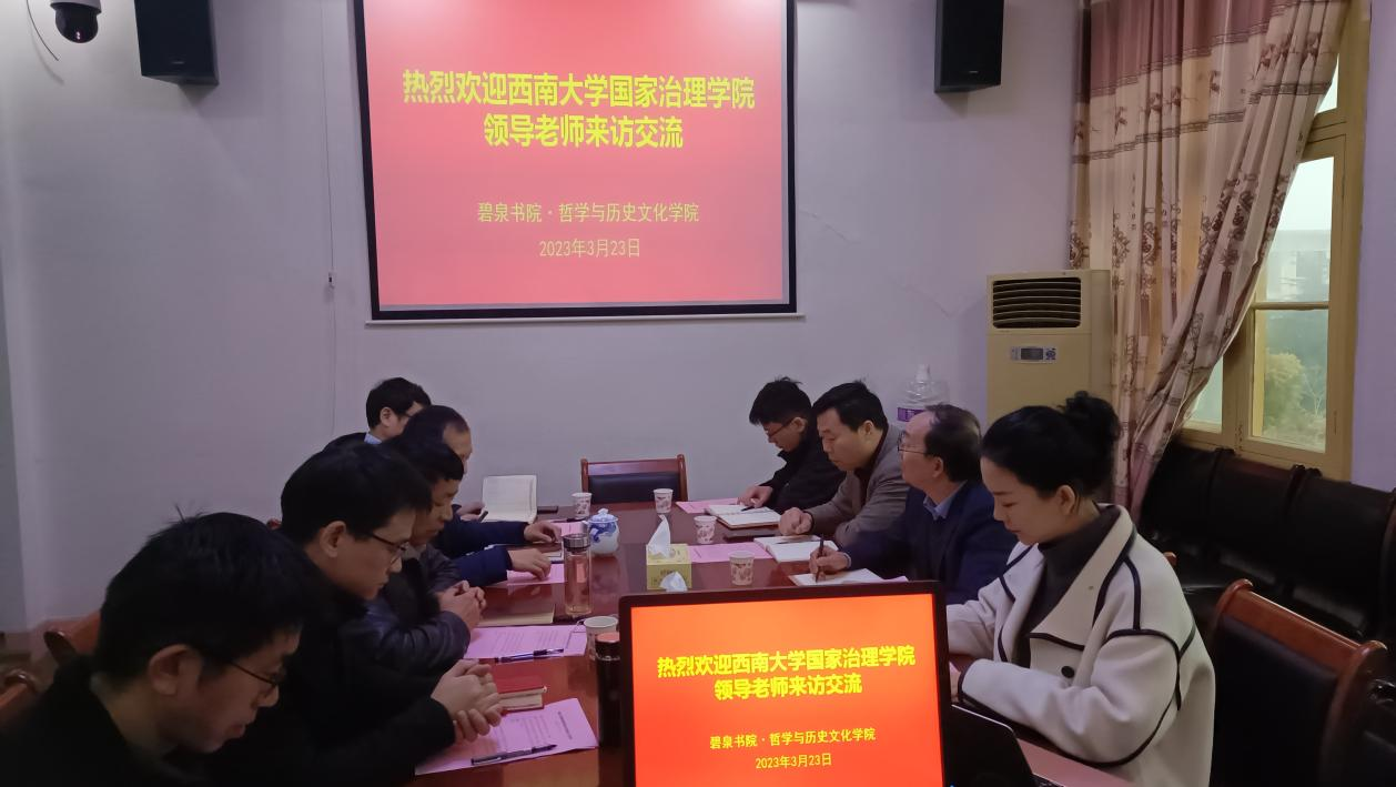 (通讯员:李格)323日上午,西南大学国家治理学院院长潘孝富教授一行4人来51暗网 进行交流。学院党委书记刘圣陶、副院长周骅、副院长郑鹏、哲学系主任陈晓华、社会学系副主任秦加军参加了本次交流座谈会。