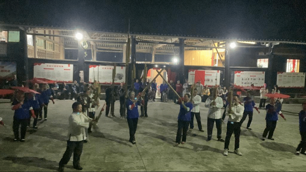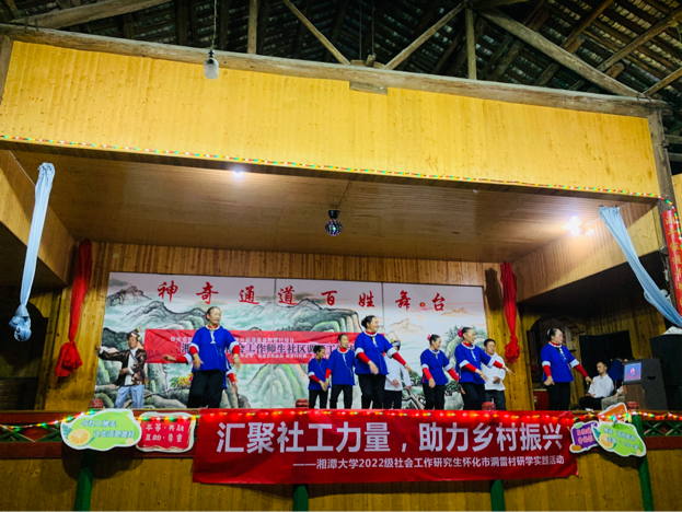 在专业的经验交流过后,洞雷村的村民们为欢迎湘大的研学团队,特为同学们准备了精彩的民族文化展示,同学们也献上了精彩的节目以表对村民们热情招待的感谢。传统侗族文化与新兴表演的结合,让同学们对于这个民族感触更为深刻。首先洞雷村芦笙队的队员们给大家带来了悠久历史的侗族传统表演“芦笙舞”,随后同学们也以一段“少年中国说”与之对话,以少年意气风发回应传统文化,你方唱罢我登场,洞雷村村民不断展现着富有民族特色的歌舞,研学同学们也以一首首象征美好生活的歌曲回应,民族文化与当代文化的交融热烈又融洽。在一片热闹的氛围中,村民们与同学们以一段代表侗族特色富有美好愿景的“侗耶”歌舞表演为本次研学之旅画上了圆满的句号。